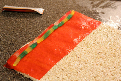 Spread and entire unrolled fruit roll up across a portion of the rice krispies. Place two gummy worms along the top of the roll. They are usually a bit shorter than the fruit roll up. Cut straight down from the edge of the gummy worm to about 1/2 inch past where the fruit roll up ends, so you've basically got a long rectangle with the gummy worms at the top.